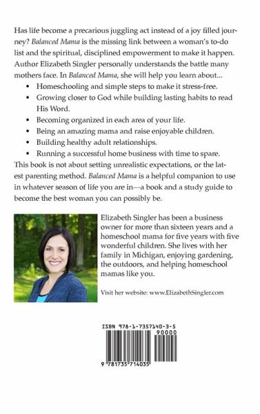 Has life become a precarious juggling act instead of a joy filled journey? Balanced Mama is the missing link between a woman's to-do list and the spiritual, disciplined empowerment to make it happen. Author Elizabeth Singler, personally understands the 'Juggling' battle which many mothers face. In Balanced Mama, she will help you: Learn about homeschooling and simple steps to make it stress free. Grow closer to God while building lasting habits to read His Word. Become organized in each area of your life. Be an amazing mama and raise enjoyable children. Build healthy adult relationships. Run a successful home business with time to spare. This book is not about setting unrealistic expectations, or the latest parenting method. Balanced Mama is a helpful companion to use in whatever season of life you are in - a book and a study guide to become the best woman you can possibly be.