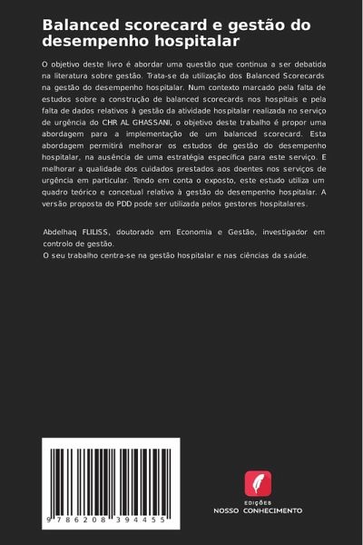 O objetivo deste livro é abordar uma questão que continua a ser debatida na literatura sobre gestão. Trata-se da utilização dos Balanced Scorecards na gestão do desempenho hospitalar. Num contexto marcado pela falta de estudos sobre a construção de balanced scorecards nos hospitais e pela falta de dados relativos à gestão da atividade hospitalar realizada no serviço de urgência do CHR AL GHASSANI, o objetivo deste trabalho é propor uma abordagem para a implementação de um balanced scorecard. Esta abordagem permitirá melhorar os estudos de gestão do desempenho hospitalar, na ausência de uma estratégia específica para este serviço. E melhorar a qualidade dos cuidados prestados aos doentes nos serviços de urgência em particular. Tendo em conta o exposto, este estudo utiliza um quadro teórico e concetual relativo à gestão do desempenho hospitalar. A versão proposta do PDD pode ser utilizada pelos gestores hospitalares.
