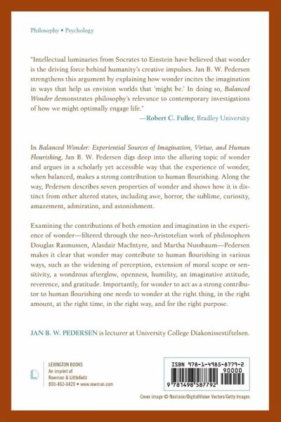 In Balanced Wonder: Experiential Sources of Imagination, Virtue, and Human Flourishing, Jan B. W. Pedersen digs deep into the alluring topic of wonder and argues in a scholarly yet accessible way that the experience of wonder, when balanced, serves as a strong contributor to human flourishing. Along the way, Pedersen describes seven properties of wonder and shows how wonder it is distinct from other altered states, including awe, horror, the sublime, curiosity, amazement, admiration, and astonishment. Examining the contribution of both emotion and imagination in the experience of wonder---filtered through the Neo-Aristotelian work of philosophers Douglas Rasmussen, Alasdair MacIntyre, and Martha Nussbaum---Pedersen also makes it clear that wonder may contribute to human flourishing in various ways, such as the widening of perception, extension of moral scope or sensitivity, a wondrous afterglow, openness, humility, an imaginative attitude, reverence, and gratitude. Importantly, for wonder to act as a strong contributor to human flourishing one needs to wonder at the right thing, in the right amount, in at the right time, in the right way, and for the right purpose.