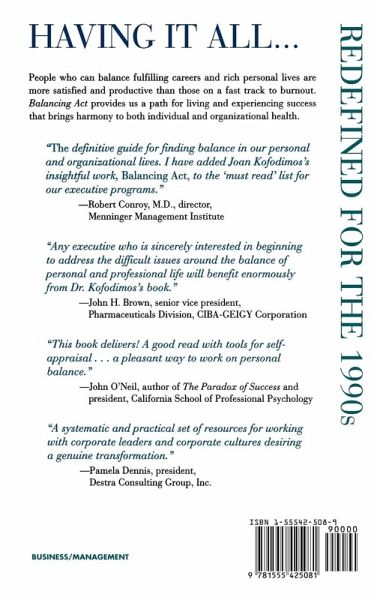 Examines the shifting demographic, economic, and social forces--the changing gAnder roles, harsher economic realities, and dual career families--that pull managers and executives out of balance. Draws on ten years of research, consulting, and training on the topic to describe the cost of imbalance to individuals and organizations and tells how to restore equilibrium. Provides numerous checklists and self-assessment tools to help determine the degree and the nature of imbalance in our lives and in our organizations. Outlines a step-by-step process for personal change that can lead to an improved quality of life and provides individuals with a blueprint for initiating organizational changes that jointly optimize personal development and organizational effectiveness."The definitive guide for finding balance in our personal and organizational lives. I have added Joan Kofodimos's insightful work to the 'must-read list' for our executive programs."--Robert W. Conroy, M.D., director, Menninger Management Institute