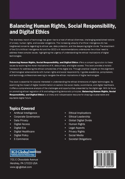 The relentless march of technology has given rise to a host of ethical dilemmas, challenging established notions of privacy, human rights, and societal obligations. The increasing ubiquity of artificial intelligence (AI) has heightened concerns regarding its ethical use, data protection, and the deepening digital divide. The enactment of the EU's Artificial Intelligence Act and the OECD's AI recommendations underscores the critical need to address these complex issues, highlighting the urgency of understanding the ethical implications of digital technologies. Balancing Human Rights, Social Responsibility, and Digital Ethics offers a compelling solution to these issues by exploring the moral implications of AI, data privacy, and digital access. This book provides a holistic framework for addressing the ethical complexities of the digital era. Through practical insights on the alignment of technological advancements with human rights and social responsibility, it guides academics, policymakers, and technology professionals seeking to navigate the ethical implications of digital technologies.