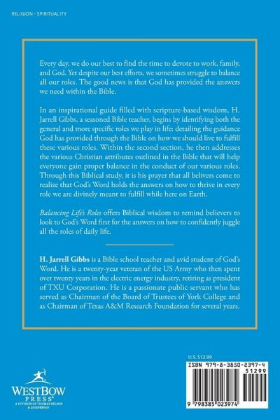 Every day, we do our best to find the time to devote to work, family, and God. Yet despite our best efforts, we sometimes struggle to balance all our roles. The good news is that God has provided the answers we need within the Bible. In an inspirational guide filled with scripture-based wisdom, H. Jarrell Gibbs, a seasoned Bible teacher, begins by identifying both the general and more specific roles we play in life; detailing the guidance God has provided through the Bible on how we should live to fulfill these various roles. Within the second section, he then addresses the various Christian attributes outlined in the Bible that will help everyone gain proper balance in the conduct of our various roles. Through this Biblical study, it is his prayer that all belivers come to realize that God's Word holds the answers on how to thrive in every role we are divinely meant to fulfill while here on Earth. Balancing Life's Roles offers Biblical wisdom to remind believers to look to God's Word first for the answers on how to confidently juggle all the roles of daily life.
