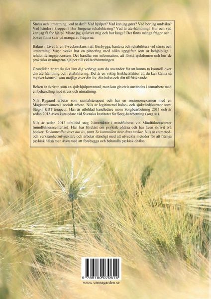 Nils Rygaard har en socionomexamen vid Lunds Universitet, och en Magisterexamen i socialt arbete vid Örebro Universitet. Nils är legitimerad hälso- och sjukvårdskurator samt Steg-1 KBT terapeut. Han arbetar för närvarande som samtalsterapeut. Han utbildades till handledare inom Sorgbearbetning 2011 och är sedan 2018 även kursledare vid Svenska Institutet för Sorg-bearbetning (sorg.se). Nils är även utbildad steg 2-instruktör i mindfulness via Mindfulnesscenter (mindfulnesscenter.se) sedan 2013. Han har bland annat föreläst om sorg och har även skrivit två böcker: Ta kontrollen över ditt liv, samt Ta kontrollen över dina tankar. Nils är en metod- och verksamhetsutvecklare. Han skapade en rehabiliteringskurs för stress och utmattning redan 2016, som har vidareutvecklats till denna kursbok. Han arbetar ständigt med att utveckla metoder för att främja psykisk hälsa men även med att förebygga och behandla psykisk ohälsa. Nils har som socionom arbetat som frivårdsinspektör inom kriminalvården Dalarna och som skolkurator i grundskolan i Borlänge och i Nora kommun, samt som primärvårdskurator inom Region Örebro län. Nils driver även ett eget företag, Vennagården, för att kunna fortsätta hjälpa fler människor att må bättre genom individuellt stöd, självhjälpsböcker, föreläsningar med mera (www.vennagarden.se).