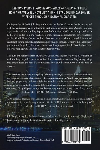 Very quietly Ron said, "You know, I think the Towers are going to go. Maybe we'd better get out of here." ßWe suddenly realized that if either of the Towers fell at a certain angle, our building was directly in the line of fall. Above the raging flames, the perpendicular steel I-beams were beginning to bulge out, softening in the heat. Again his unnaturally quiet voice, "I can't stay here. If the Towers fall on us, I'll die of fright." (BALCONY VIEW - a 9/11/ Diary ) Julia Frey's account begins on September 11, 2001, as the couple decide that despite her husband's illness, they must somehow flee. They abandon his wheelchair; he is too frail to climb on a boat. Later that day, covered with ashes, they struggle home through a neighborhood pitched into destruction and chaos, to look out his study window at their new view: "the stage set for Dante's Inferno." The domino effect of one burning, collapsing building setting fire to the next one makes it clear that their own building could still go. "The electricity was out. Ron could never go down 26 flights on his rear end. We were trapped in the sky." That's when Julia decides to write it all down -- if only for the people who will find their bodies. Describing the first night in the the ruins, being evacuated, then returning weeks later, to live at Ground Zero, she discovers that their world has totally changed, yet finally not changed at all. "Our previous problems didn't magically disappear. They were just waiting for us to come back in the door." This powerful narrative of double coping -- with Ron's progressing disability and with the after-effects of 9/11 -- describes a situation the manuals don't cover -- caregiving in a disaster. Julia Frey's intense, wryly humorous 'you are there' style buoys up the diary and moves it swiftly along, catching us in a gripping, touching, brave, tender, funny story of falling towers, a failing husband and a floundering ménage à trois. "Nothing happens in a vacuum," she says, weaving in the leitmotif of a long-term love affair. Unflinchingly, she faces the ruins out the window and her own disturbing ambivalence as she sacrifices her creative and professional life to become a full-time caregiver. Ron is no angel, either. He's a self-centered, willful novelist who after convincing her to take a lover, now wants her to give him up. "What makes him think he can turn us off and on like televisions?" she wonders. Ron's own writing creates an important counterpoint to Julia's voice, as she weaves into her diary quotations from his posthumous novel, Last Fall (FC2, 2005). In a poignant Coda, another tale comes to light -- the almost supernatural coincidences between Ron's last short story and a series of events that occur after Ron dies. There is even a happy ending. Now, twenty years later, Julia's experience is no longer an extraordinary occurrence. This historical diary is important not only to historians, sociologists and psychologists helping patients recover from PTSD, but above all, to those who find themselves unexpectedly plunged into similar catastophic situations: becoming caregivers during a major emergency. The international Covid-19 pandemic and regional climate-change disasters like wildfires, tornadoes, hurricanes, repeated Gulf Coast flooding and the 2021 Texas freezes have left many unprepared peopleto deal with a very ill family member, without electricity, gas or clean water. Julia's dilemma unfortunately is no longer rare. Many people will find it comforting to know that even unheroic people manage to get through such times.