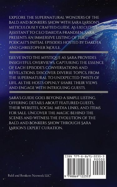 Embark on a spellbinding journey through the realms of the supernatural with "Bald and Bonkers Show: Episode Guide Part 1." Curated by Sara Larson, Executive Assistant to the CEO of Bald and Bonkers Network LLC, Dakota Frandsen, this guide is your passport to the enigmatic and entertaining world of the popular podcast hosted by Dakota Frandsen and Christopher Moule. Dive into the mystique as Sara meticulously compiles a comprehensive listing of the initial episodes from the Bald and Bonkers Show, offering readers a unique perspective on each captivating installment. Sara, with her keen attention to detail, provides insightful overviews, capturing the essence of the conversations and revelations that unfold in each episode. Within these pages, you'll discover the diverse topics explored by Dakota and Christopher, ranging from supernatural phenomena to unexpected twists of life. As the hosts openly share their views and engage with a myriad of guests, Sara's guide becomes a portal to the heart of the Bald and Bonkers universe. But this guide is more than just a catalog of episodes. Sara Larson's unique touch adds depth to the experience. Learn about the fascinating guests featured on the show, their websites, social media links, and even items they may have for sale. Sara ensures that every detail enhances your understanding and enjoyment of the Bald and Bonkers Show. In "Bald and Bonkers Show: Episode Guide Part 1," Sara Larson unveils the behind-the-scenes magic, providing exclusive insights into the making of the podcast and the connections formed in the process. Navigate through the supernatural, explore unexpected facets of life, and witness the evolution of the show through Sara's expertly curated guide. Whether you're a dedicated fan of the Bald and Bonkers Show or a newcomer intrigued by the supernatural, this episode guide is your key to unlocking the secrets, stories, and surprises that await within the captivating world of Dakota Frandsen and Christopher Moule. Step into the unknown, embrace the unexpected, and immerse yourself in the first part of this extraordinary episode guide. The adventure begins here!