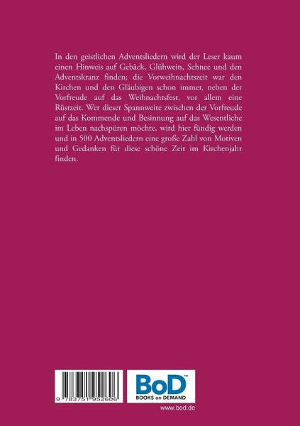 In den geistlichen Adventsliedern wird der Leser kaum einen Hinweis auf Gebäck, Glühwein, Schnee und den Adventskranz finden; die Vorweihnachtszeit war den Kirchen und den Gläubigen schon immer, neben der Vorfreude auf das Weihnachtsfest, vor allem eine Rüstzeit. Wer dieser Spannweite zwischen der Vorfreude auf das Kommende und Besinnung auf das Wesentliche im Leben nachspüren möchte, wird hier fündig werden und in 500 Adventsliedern eine große Zahl von Motiven und Gedanken für diese schöne Zeit im Kirchenjahr finden.