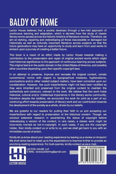 Baldy Of Nome This book is a result of an effort made by us towards making a contribution to the preservation and repair of original classic literature. In an attempt to preserve, improve and recreate the original content, we have worked towards: 1. Type-setting & Reformatting: The complete work has been re-designed via professional layout, formatting and type-setting tools to re-create the same edition with rich typography, graphics, high quality images, and table elements, giving our readers the feel of holding a 'fresh and newly' reprinted and/or revised edition, as opposed to other scanned & printed (Optical Character Recognition - OCR) reproductions. 2. Correction of imperfections: As the work was re-created from the scratch, therefore, it was vetted to rectify certain conventional norms with regard to typographical mistakes, hyphenations, punctuations, blurred images, missing content/pages, and/or other related subject matters, upon our consideration. Every attempt was made to rectify the imperfections related to omitted constructs in the original edition via other references. However, a few of such imperfections which could not be rectified due to intentional\unintentional omission of content in the original edition, were inherited and preserved from the original work to maintain the authenticity and construct, relevant to the work. We believe that this work holds historical, cultural and/or intellectual importance in the literary works community, therefore despite the oddities, we accounted the work for print as a part of our continuing effort towards preservation of literary work and our contribution towards the development of the society as a whole, driven by our beliefs. We are grateful to our readers for putting their faith in us and accepting our imperfections with regard to preservation of the historical content. HAPPY READING!
