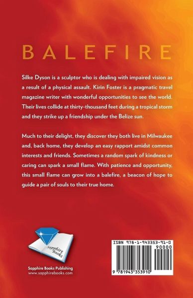 Silke Dyson is a free-spirited artist and teacher struggling with a vision impairment as a result of a physical altercation. Kirin Foster is a pragmatic Type A writer for a travel magazine with great opportunities for travel, and a growing restlessness. Their lives intersect at thirty-thousand feet during a tropical storm. With plans lost in the ensuing confusion, they form an unlikely friendship. The relationship strengthens in the warm tropical sunshine of the Belizean Cayes. To their surprise, they discover a real connection with backgrounds in Milwaukee. Back home they continue an easy rapport with common interests and mutual friends. Sometimes a random spark of kindness or caring can kindle a small flame. With patience and serendipity, a small flame can grow into a balefire-a beacon of hope to guide a pair of lost soul's home.