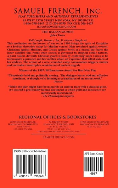 Full Length, Drama / 2m, 3f, chorus / Simple set. This meditation on the horror of war set in 1990 brings the spirit of Euripides to a Serbian detention camp for Muslim women. Men are pitted against women, Christians against Muslims, and Croats against Serbs in a drama that bares the inner conflicts that result when society is governed by illogical ethnic hatreds. A hard boiled, devoutly Christian guard is torn by conflicting inner voices as he interrogates a prisoner and her mother about an ex