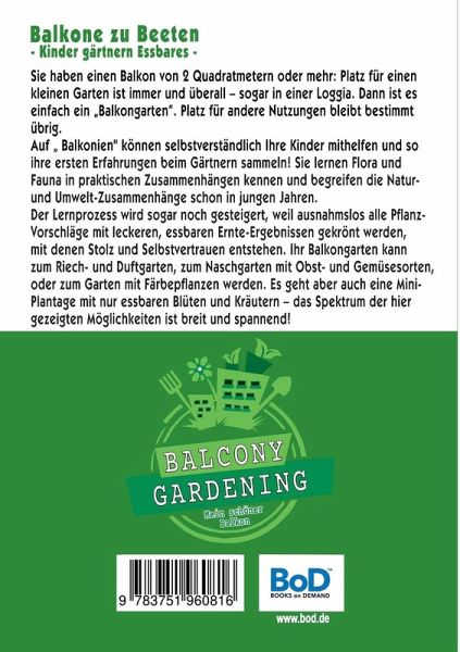 Sie haben einen Balkon von 2 Quadratmetern oder mehr: Platz für einen kleinen Garten ist immer und überall - sogar in einer Loggia. Dann ist es einfach ein Balkongarten. Platz für andere Nutzungen bleibt bestimmt übrig. Auf Balkonien können selbstverständlich Ihre Kinder mithelfen und so ihre ersten Erfahrungen beim Gärtnern sammeln! Sie lernen Flora und Fauna in praktischen Zusammenhängen kennen und begreifen die Natur- und Umwelt-Zusammenhänge schon in jungen Jahren. Der Lernprozess wird sogar noch gesteigert, weil ausnahmslos alle Vorschläge mit leckeren, essbaren Ernte-Ergebnissen gekrönt werden, mit denen Stolz und Selbstvertrauen entstehen. Ihr Balkongarten kann zum Riech- und Duftgarten, zum Naschgarten mit Obst- und Gemüsesorten, oder zum Garten mit Färbepflanzen werden. Es geht aber auch eine Mini-Plantage mit nur essbaren Blüten und Kräutern - das Spektrum der hier gezeigten Möglichkeiten ist breit und spannend!
