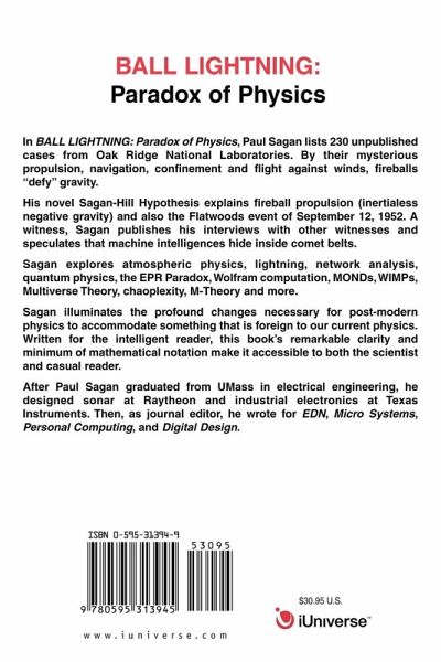 Paul Sagan demonstrates in Ball Lightning: Paradox of Physics that fireballs defy gravity and offer clues to physics' final Theory of Everything. As evidence, he lists 200 unpublished, amazing cases from Oak Ridge National Laboratories. By their mysterious propulsion, navigation, confinement, quasi-intelligent behavior, and their flight against strong winds, fireballs "violate" physics and "defy" gravity and provide clues to inertialess-inverse-gravity. His friend, Golka and Corum recreated Nikola Tesla's Colorado Springs wireless power Zenneck waves and electric balls. The Sagan-Hill Hypothesis explains fireball propulsion and what Sagan once witnessed--the terrifying Flatwoods Monster and its alien craft--which set off a near nationwide panic. He publishes here his exclusive interviews with witnesses Kathy May and Dale Leavitt, and proposes that aliens are robot machine intelligences who live hidden amongst our asteroid and comet belts. SETI fails because aliens use lasers and disclosure will create world anarchy. "Sagan illuminates the profound changes necessary for post-modern physics to accommodate something that is foreign to our current physics. Written for the intelligent reader, this book's remarkable clarity and minimum of mathematical notation make it accessible to both the scientist and casual reader." --Albert Einstein's ghost