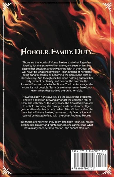 Honour. Family. Duty. Those are the words of House Baxteel and what Rígan has lived by for the entirety of her twenty-six years of life. But despite her ambition and unwavering faith in the Gods, she will never be what she longs for. Rígan dreams of her name being sung in ballads, of becoming the hero in the tales of Elrin's history. And though she has done nothing but fulfil her duty, protect her family, and honour the promise the Anointed Houses made to the Divine Triad centuries ago, she knows it's not possible. Bastards are never remembered, not even when they achieve the unfathomable. However, soon her status will be the least of her problems. There is a rebellion brewing amongst the common folk of Elrin, and it threatens the very peace the Anointed promised to uphold. Knowing she must put aside her dreams, Rígan goes north under her father's orders. After all, her brother, the real heir of House Baxteel, has never truly faced a foe and can not be trusted to lead with the other Anointed Houses. But things are not what they seem and soon Rígan will realize despite her bravery and righteousness, she cannot stop what has already been set into motion...she cannot stop fate.