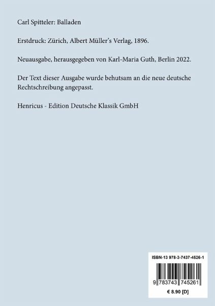 Carl Spitteler: Balladen. Vollständige Neuausgabe der Ausgabe von 1896Erstdruck: Zürich, Albert Müller's Verlag, 1896.Neuausgabe, herausgegeben von Karl-Maria Guth, Berlin 2023.Der Text dieser Ausgabe wurde behutsam an die neue deutsche Rechtschreibung angepasst.Gesetzt aus der Minion Pro, 11 pt.Die Sammlung Hofenberg erscheint im Verlag Henricus - Edition Deutsche Klassik GmbH, BerlinÜber den Autor:1845 als Sohn eines liberalen Politikers in Liestal in der Schweiz geboren, beginnt Spitteler zunächst ein Jurastudium in Basel und studiert ab 1865 Theologie in Heidelberg, Zürich und Basel. 1870 tritt er die Stelle eines Erziehers im Haus eines russischen Generals in St. Petersburg an. Neun Jahre später kehrt er in die Schweiz zurück und arbeitet als Lehrer bis er 1885 Redakteur der »Neuen Züricher Zeitung« wird. Erst mit seinem Epos »Olympischer Frühling« stellt sich 1905 die gewünschte Anerkennung seines literarischen Schaffens ein. 1914 spricht er sich für die Neutralität der Schweiz und gegen die Vereinnahmung seines Werkes durch den deutschen Nationalismus aus. 1920 erhält er rückwirkend für 1919 den Nobelpreis für Literatur. Am 29. Dezember 1924 stirbt Carl Spitteler in Luzern.