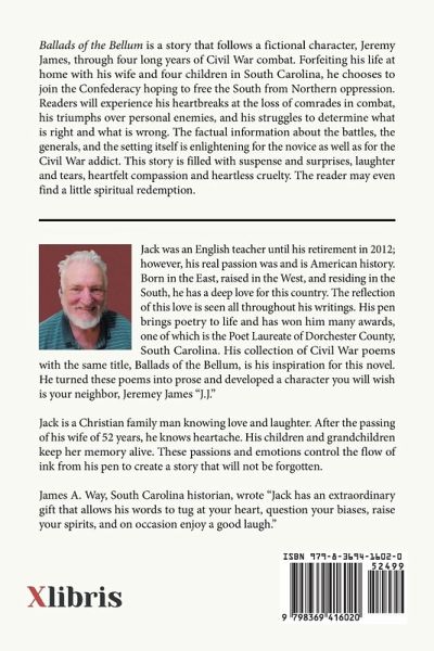 Jack was an English teacher until his retirement in 2012; however, his real passion was and is American history. Born in the East, raised in the West, and residing in the South, he has a deep love for this country. The reflection of this love is seen all throughout his writings. His pen brings poetry to life and has won him many awards, one of which is the Poet Laureate of Dorchester County, South Carolina. His collection of Civil Was poems with the same title, Ballads of the Bellum, is his inspiration for this novel. He turned these poems into prose and developed a character you will wish is your neighbor, Jeremey James "J.J." Jack is a Christian family man knowing love and laughter. After the passing of his wife of 52 years, he knows heartache. His children and grandchildren keep her memory alive. These passions and emotions control the flow of ink from his pen to create a story that will not be forgotten. James A. Way, South Carolina historian, wrote "Jack has an extraordinary gift that allows his words to tug at your heart, question your biases, raise your spirits, and on occasion enjoy a good laugh."