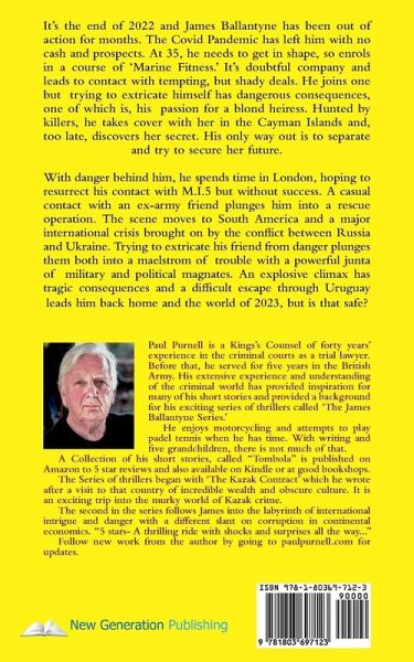 It's the end of 2022 and James Ballantyne has been out of action for months. The Covid Pandemic has left him with no cash and prospects. At 35, he needs to get in shape, so enrols in a course of 'Marine Fitness.' It's doubtful company and leads to contact with tempting, but shady deals. He joins one but trying to extricate himself has dangerous consequences, one of which is, his passion for a blond heiress. Hunted by killers, he takes cover with her in the Cayman Islands and, too late, discovers her secret. His only way out is to separate and try to secure her future. With danger behind him, he spends time in London, hoping to resurrect his contact with M.I.5 but without success. A casual contact with an ex-army friend plunges him into a rescue operation. The scene moves to South America and a major international crisis brought on by the conflict between Russia and Ukraine. Trying to extricate his friend from danger plunges them both into a maelstrom of trouble with a powerful junta of military and political magnates. An explosive climax has tragic consequences and a difficult escape through Uruguay leads him back home and the world of 2023, but is that safe?
