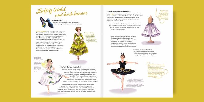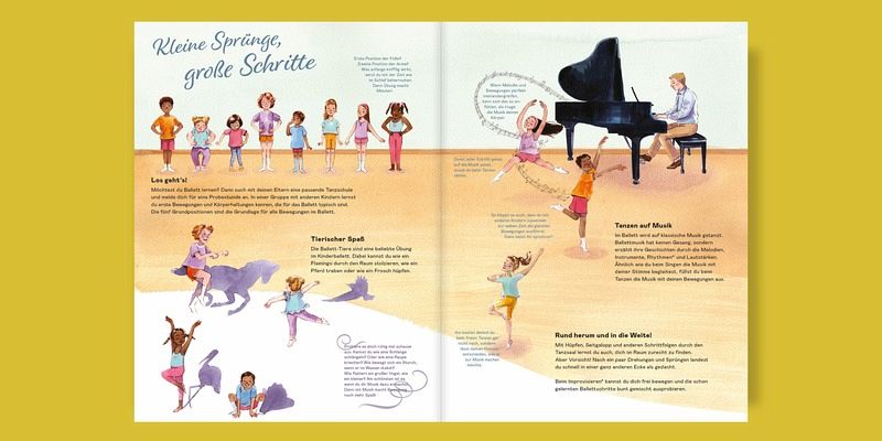 Dieses wunderschön illustrierte Kinderbuch nimmt uns mit in die faszinierende Welt des Balletts. Von den ersten Tanzschritten bis zu den schönsten Stücken und berühmtesten Ballerinen - hier entdecken Kinder ab 5 Jahren alles, was es über das Ballett zu wissen gibt. Was passiert in einer Ballettstunde? Wie sehen die Grundpositionen aus? Wer hat das Ballett erfunden? Und warum benutzt die Lehrerin so viele französische Wörter? All diese Fragen werden auf spielerische Weise beantwortet. Dabei erfahren wir nicht nur spannendes Wissen aus der Ballettgeschichte, sondern tauchen auch in die zauberhaften Märchenwelten berühmter Ballettklassiker wie Der Nussknacker, Schwanensee und Giselle ein. Auch beeindruckende Vorbilder wie Vaslav Nijinsky oder Misty Copeland werden vorgestellt. Und wer schon immer wissen wollte, wie der Alltag einer echten Primaballerina aussieht, bekommt einen Einblick in das Leben der Profitänzer:innen Friedemann Vogel und Polina Semionova. Mit kreativen Anregungen zum Mitmachen können Kinder außerdem erste Ballettbewegungen ausprobieren, ein eigenes kleines Stück erfinden und ihre Freude am Tanzen entdecken.