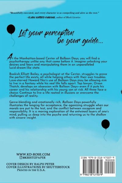 Genre-blending and emotionally rich, Balloon Days powerfully highlights the longing for acceptance, the agonizing struggle when our morals are put to the test, and the conflict between escapism and responsibility. It is a moving exploration of the entwined layers of one's mind, pulling us deep into the psyche and returning us to the shallow with sincere insight. Let Your Perception Be Your Guide... At the Manhattan-based Center of Balloon Days, you will find a psychotherapy unlike any that came before it. Imagine unlocking your desires and your fears and manipulating them in an unparalleled lucid-dream-like state. Bookish Elliott Bailey, a young psychologist at the Center, struggles to prove the perfect life exists, all while helping others with their own troubles; love-starved Howard Nor's use of Balloon Days lends him temporary respite from the grips of depression, but they may be allowing him to live in a fantasy while his real life falls apart; and top lawyer Orson Thatch develops an obsession with Balloon Days, as it's the only time he can see his dead wife-even if it risks his career and his relationship with his seven-year-old son. All three face a choice: Continue to live a life rooted in illusions or overcome the challenges of reality.