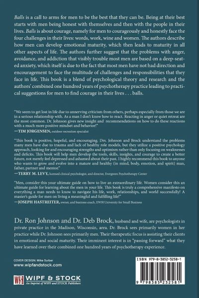 Balls is a call to arms for men to be the best that they can be. Being at their best starts with men being honest with themselves and then with the people in their lives. Balls is about courage, namely for men to courageously and honestly face the four challenges in their lives: words, women, work, and ""wine"" (addictions). The authors describe how men can develop emotional maturity, which then leads to maturity in all other aspects of life. The authors further suggest that the problems with anger, avoidance, and addiction that visibly trouble most men are based on a deep-seated anxiety, which itself is due to the fact that most men have not had direction and encouragement to face the multitude of challenges and responsibilities that they face in life. This book is a blend of psychological theory and research and the authors' combined one hundred years of psychotherapy practice leading to practical suggestions for men to find courage in their lives . . . balls.