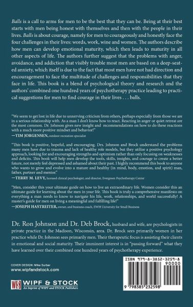 Balls is a call to arms for men to be the best that they can be. Being at their best starts with men being honest with themselves and then with the people in their lives. Balls is about courage, namely for men to courageously and honestly face the four challenges in their lives: words, women, work, and ""wine"" (addictions). The authors describe how men can develop emotional maturity, which then leads to maturity in all other aspects of life. The authors further suggest that the problems with anger, avoidance, and addiction that visibly trouble most men are based on a deep-seated anxiety, which itself is due to the fact that most men have not had direction and encouragement to face the multitude of challenges and responsibilities that they face in life. This book is a blend of psychological theory and research and the authors' combined one hundred years of psychotherapy practice leading to practical suggestions for men to find courage in their lives . . . balls.