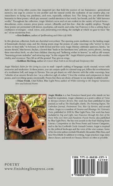 Balm for the Living offers poems of hope and celebrates our very human urge to connect with each other. These poems lift us with kestrels and cedar waxwings, anchor us solidly to the earth, show us how to ebb and flow with life's tides, and help us to consider profound loss. Reading these poems, we contemplate stars, tango in Havana, and celebrate life in all its beauty and mystery.