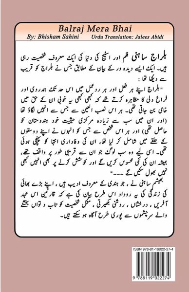 Balraj Mera Bhai (Balraj My brother) is an interesting biography written by his own brother Bhisham Sahni. This book has been translated in Urdu by Jalees Abidi. Balraj Sahni, the noted film and theatre personality, was, in the words of his close observer, generous and warm-hearted in his responses, almost to a fault; utterly loyal to the causes with which he was associated.
