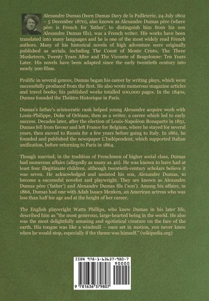 Alexandre Dumas (born Dumas Davy de la Pailleterie, 24 July 1802 - 5 December 1870), also known as Alexandre Dumas père (where père is French for 'father', to distinguish him from his son Alexandre Dumas fils), was a French writer. His works have been translated into many languages and he is one of the most widely read French authors. Many of his historical novels of high adventure were originally published as serials, including The Count of Monte Cristo, The Three Musketeers, Twenty Years After and The Vicomte of Bragelonne: Ten Years Later. His novels have been adapted since the early…mehr