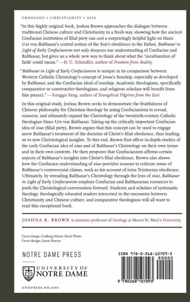 In this original study, Joshua Brown seeks to demonstrate the fruitfulness of Chinese philosophy for Christian theology by using Confucianism to reread, reassess, and ultimately expand the Christology of the twentieth-century Catholic theologian Hans Urs von Balthasar. Taking up the critically important Confucian idea of xiao (filial piety), Brown argues that this concept can be used to engage anew Balthasar's treatment of the doctrine of Christ's filial obedience, thus leading us to new Christological insights. To this end, Brown first offers in-depth studies of the early Confucian idea of xiao and of Balthasar's Christology on their own terms and in their own contexts. He then proposes that Confucianism affirms certain aspects of Balthasar's insights into Christ's filial obedience. Brown also shows how the Confucian understanding of xiao provides reasons to criticize some of Balthasar's controversial claims, such as his account of intra-Trinitarian obedience. Ultimately, by rereading Balthasar's Christology through the lens of xiao, Balthasar in Light of Early Confucianism employs Confucian and Balthasarian resources to push the Christological conversation forward. Students and scholars of systematic theology, theologically educated readers interested in the encounter between Christianity and Chinese culture, and comparative theologians will all want to read this exceptional book.