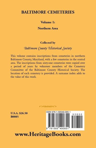 This volume contains inscriptions from cemeteries in northern Baltimore County, Maryland, with a few cemeteries in the central area. The inscriptions from sixty-one cemeteries were copied over a period of years by volunteer members of the Cemetery Committee of the Baltimore County Historical Society. The location of each cemetery is provided. A surname index adds to the value of this work.