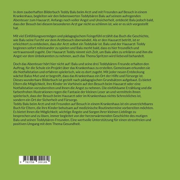 In dem zauberhaften Bilderbuch Teddy Balu beim Arzt und mit Freunden auf Besuch in einem Krankenhaus, begleiten wir den liebenswerten Teddybären Balu auf seinem aufregenden Abenteuer zum Hausarzt. Anfangs noch voller Angst und Unsicherheit, entdeckt Balu jedoch bald, dass der Besuch bei diesem besonderen Arzt gar nicht so schlimm ist, wie er es sich vorgestellt hat.Mit viel Einfühlungsvermögen und pädagogischem Feingefühl erzählt das Buch die Geschichte, wie Balu seine Furcht vor dem Arztbesuch überwindet. Als er den Hausarzt betritt, ist er erleichtert zu entdecken, dass der Arzt selbst ein Teddybär ist. Balu und der Hausarzt-Teddy beginnen sofort miteinander zu spielen und Balu merkt bald, dass es hier freundlich und vertrauensvoll zugeht. Der Hausarzt Teddy nimmt sich Zeit, um Balu alles zu erklären und ihm die Angst vor dem Unbekannten zu nehmen, auch das Thema Spritzen wird liebevoll behandelt.Doch das Abenteuer hört hier nicht auf! Balu und seine drei Teddybären-Freunde erhalten den Auftrag, für die Schule ein Projekt über das Krankenhaus zu erstellen. Gemeinsam erkunden sie die Notfallstation und erfahren spielerisch, wie es dort zugeht. Mit jeder neuen Entdeckung wächst Balus Mut und er begreift, dass das Krankenhaus ein Ort der Hilfe und Fürsorge ist.Dieses wunderbare Bilderbuch ist gezielt nach pädagogischen Grundsätzen aufgebaut. Es bietet Eltern die Möglichkeit, ihre Kinder im Vorhinein auf den Besuch beim Hausarzt oder eine Notfallstation vorzubereiten und ihnen die Angst zu nehmen. Die einfühlsame Erzählung und die farbenfrohen Illustrationen regen die Fantasie der kleinen Leser an und vermitteln ihnen spielerisch, dass der Besuch beim Hausarzt oder im Krankenhaus nichts Schreckliches ist, sondern ein Ort der Sicherheit und Fürsorge.Teddy Balu beim Arzt und mit Freunden auf Besuch in einem Krankenhaus ist ein unverzichtbares Buch für Eltern, die ihre Kinder behutsam auf medizinische Routinetermine vorbereiten möchten. Es bietet ihnen die Möglichkeit, wichtige Ängste und Sorgen ihrer kleinen Lieblinge zu besprechen und zu lösen, immer begleitet von der herzerwärmenden Geschichte des mutigen Balu und seinen Teddybären-Freunden. Eine wertvolle Unterstützung für einen stressfreien und positiven Umgang mit dem Thema Gesundheit.