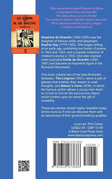 Delphine de Girardin (1804-1855) was the daughter of famous writer and playwright Sophie Gay (1776-1852). She began writing at an early age, publishing two books of poems in 1824 and 1824, and a popular collection of children's stories in 1833. She later married writer-journalist Emile de Girardin (1802-1881) and became an important figure in the Romantic Movement. This book collects two of her best Romantic fantasies: The Lorgnon (1831), about a pair of glasses that enables their wearer to read thoughts, and Balzac's Cane (1836), in which the famous author allows a young man down on is luck to borrow the eponymous object, which confers upon its owner the gift of invisibility. These two stories remain highly readable today, all the more so if one can discover them with an awareness of their ground-breaking qualities.