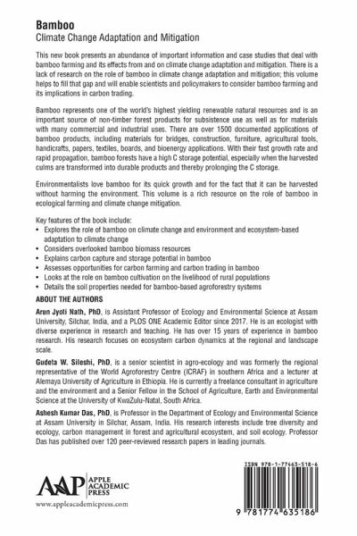 1. General Introduction 2. Ecosystem Services and Human Uses of Bamboos 3. Soil Quality Assessment of Bamboo-Based Systems 4. Role of Bamboo in Ecosystem-Based Adaptation 5. Traditional Bamboo Products: Are They Green? 6. Biomass Models 7. Bamboo-Based Home Gardens: Opportunities for Biomass Production and Carbon Sequestration 8. Soil Properties and Carbon Sequestration in Bamboo-Based Systems 9. Carbon Farming and Carbon Trading 10. Challenges, Conclusions, and Recommendations