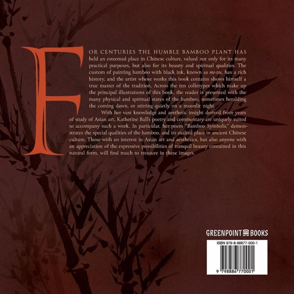 For centuries the humble bamboo plant has held an esteemed place in Chinese culture, valued not only for its many practical purposes, but also for its beauty and spiritual qualities. The custom of painting bamboo with black ink, known as mo-tsu, has a rich history, and the artist whose works this book contains shows himself a true master of the tradition. Across the ten collotypes which make up the principal illustrations of this book, the reader is presented with the many physical and spiritual states of the bamboo, sometimes heralding the coming dawn, or stirring quietly on a moonlit night. With her vast knowledge and aesthetic insight derived from years of study of Asian art, Katherine Ball's poetry and commentary are uniquely suited to accompany such a work. In particular, her poem "Bamboo Symbolic" demonstrates the special qualities of the bamboo, and its exalted place in ancient Chinese culture. Those with an interest in Asian art and aesthetics, but also anyone with an appreciation of the expressive possibilities of tranquil beauty contained in this natural form, will find much to treasure in these images.