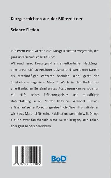 In diesem Band werden drei Kurzgeschichten vorgestellt, die ganz unterschiedlicher Art sind: Während Isaac Kwacszynski als amerikanischer Neubürger eher unverhofft zu Reichtum gelangt und damit sein Dasein als mittelmäßiger Vertreter beenden kann, gerät der überhebliche Ingenieur Mark T. Webb in den Radar des amerikanischen Geheimdienstes. Aus diesem kann er sich nur mit Hilfe seines Erfindungsgeistes und tatkräftiger Unterstützung seiner Mutter befreien. Willibald Himmel erfährt auf seiner Forschungsreise in die Naga Hills, mit der er wichtiges Material für seine Habilitation sammeln will, Dinge, die ihn zwar forscherisch nicht weiter bringen, sein Leben aber ganz anders bereichern.