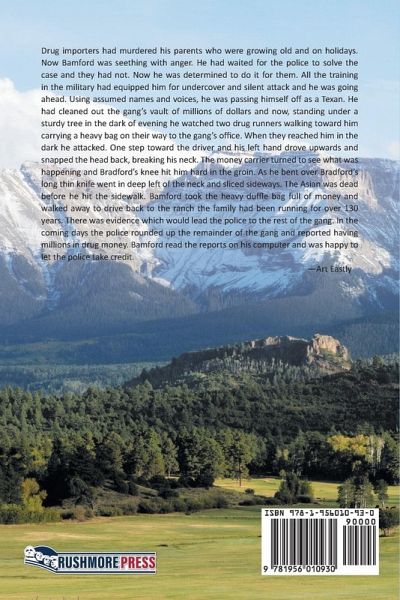 Drug importers had murdered his parents who were growing old and on holidays. Now Bamford was seething with anger. He had waited for the police to solve the case and they had not. Now he was determined to do it for them. All the training in the military had equipped him for undercover and silent attack and he was going ahead. Using assumed names and voices, he was passing himself off as a Texan. He had cleaned out the gang's vault of millions of dollars and now, standing under a sturdy tree in the dark of evening he watched two drug runners walking toward him carrying a heavy bag on their way to the gang's office. When they reached him in the dark he attacked. One step toward the driver and his left hand drove upwards and snapped the head back, breaking his neck. The money carrier turned to see what was happening and Bradford's knee hit him hard in the groin. As he bent over Bradford's long thin knife went in deep left of the neck and sliced sideways. The Asian was dead before he hit the sidewalk. Bamford took the heavy duffle bag full of money and walked away to drive back to the ranch the family had been running for over 130 years. There was evidence which would lead the police to the rest of the gang. In the coming days the police rounded up the remainder of the gang and reported having millions in drug money. Bamford read the reports on his computer and was happy to let the police take credit. -Art Eastly
