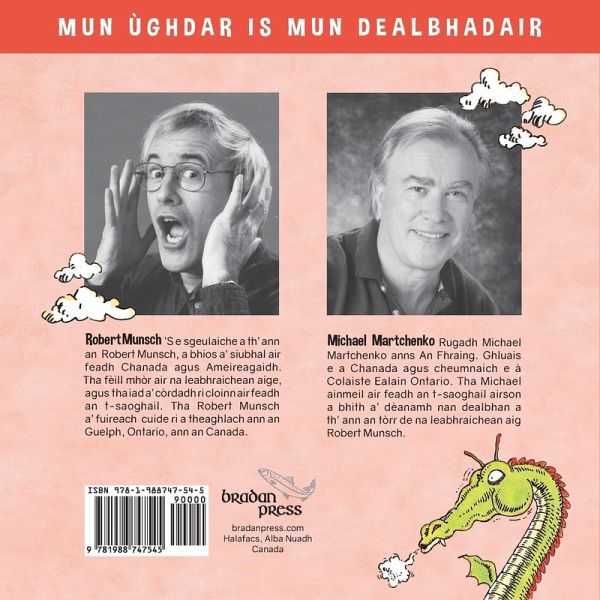 'S e sgeulaiche a th' ann an Robert Munsch, a bhios a' siubhal air feadh Chanada agus Ameireagaidh. Tha fèill mhòr air na leabhraichean aige, agus tha iad a' còrdadh ri cloinn air feadh an t-saoghail. Tha Robert Munsch a' fuireach cuide ri a theaghlach ann an Guelph, Ontario, ann an Canada. / Robert Munsch is a storyteller whose travels have taken him all over Canada and the USA. His popular books are enjoyed by children all over the world. Robert Munsch lives in Guelph, Ontario, Canada, with his family.