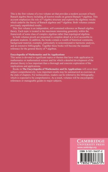 This is the first volume of a two volume set that provides a modern account of basic Banach algebra theory including all known results on general Banach *-algebras. This account emphasises the role of *-algebraic structure and explores the algebraic results which underlie the theory of Banach algebras and *-algebras. Both volumes contain previously unpublished results. This first volume is an independent, self-contained reference on Banach algebra theory. Each topic is treated in the maximum interesting generality within the framework of some class of complex algebras rather than topological algebras. In both volumes proofs are presented in complete detail at a level accessible to graduate students. In addition, the books contain a wealth of historical comments, background material, examples, particularly in noncommutative harmonic analysis, and an extensive bibliography. Together these books will become the standard reference for the general theory of *-algebras.