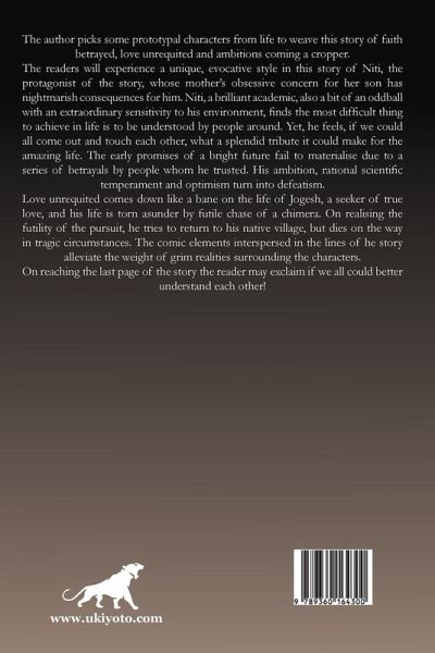 The author picks some prototypal characters from life to weave this story of faith betrayed, love unrequited and ambitions coming a cropper. The readers will experience a unique, evocative style in this story of Niti, the protagonist of the story, whose mother's obsessive concern for her son has nightmarish consequences for him. Niti, a brilliant academic, also a bit of an oddball with an extraordinary sensitivity to his environment, finds the most difficult thing to achieve in life is to be understood by people around. Yet, he feels, if we could all come out and touch each other, what a splendid tribute it could make for the amazing life. The early promises of a bright future fail to materialise due to a series of betrayals by people whom he trusted. His ambition, rational scientific temperament and optimism turn into defeatism. Love unrequited comes down like a bane on the life of Jogesh, a seeker of true love, and his life is torn asunder by futile chase of a chimera. On realising the futility of the pursuit, he tries to return to his native village, but dies on the way in tragic circumstances. The comic elements interspersed in the lines of he story alleviate the weight of grim realities surrounding the characters. On reaching the last page of the story the reader may exclaim if we all could better understand each other!