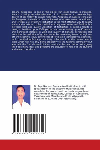 Banana (Musa spp.) is one of the oldest fruit crops known to mankind. Banana is being an exhaustive crop; it is paramount to maintain high degree of soil fertility to ensure high yield. Adoption of modern techniques like fertigation is needed to be emphasised to increase water use efficiency and fertilizer use efficiency. Fertigation is the most effective way to supply water and nutrients to plants which not only saves water and fertilizer but increases yield and quality. Adoption of fertigation in banana results in saving of fertilizer up to 25-30 percent and water saving up to 40 percent and significant increase in yield and quality of banana. Fertigation also minimizes the pollution of ground water by preventing losses through run off and Leaching. Thus, beyond doubt fertigation technology is a potential tool to easily double the productivity of banana from the present level in India which will not only bring prosperity to the farming community but also fulfil the fruit demandof the country in the near future. With going this book many ideas and problems are discussed to help out the students and research workers.