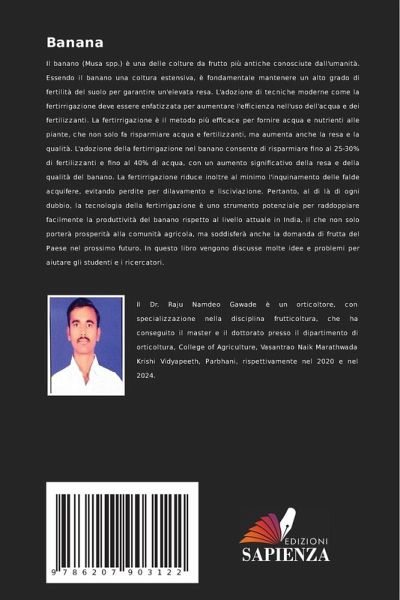 Il banano (Musa spp.) è una delle colture da frutto più antiche conosciute dall'umanità. Essendo il banano una coltura estensiva, è fondamentale mantenere un alto grado di fertilità del suolo per garantire un'elevata resa. L'adozione di tecniche moderne come la fertirrigazione deve essere enfatizzata per aumentare l'efficienza nell'uso dell'acqua e dei fertilizzanti. La fertirrigazione è il metodo più efficace per fornire acqua e nutrienti alle piante, che non solo fa risparmiare acqua e fertilizzanti, ma aumenta anche la resa e la qualità. L'adozione della fertirrigazione nel banano consente di risparmiare fino al 25-30% di fertilizzanti e fino al 40% di acqua, con un aumento significativo della resa e della qualità del banano. La fertirrigazione riduce inoltre al minimo l'inquinamento delle falde acquifere, evitando perdite per dilavamento e lisciviazione. Pertanto, al di là di ogni dubbio, la tecnologia della fertirrigazione è uno strumento potenziale per raddoppiare facilmente la produttività del banano rispetto al livello attuale in India, il che non solo porterà prosperità alla comunità agricola, ma soddisferà anche la domanda di frutta del Paese nel prossimo futuro. In questo libro vengono discusse molte idee e problemi per aiutare gli studenti e i ricercatori.