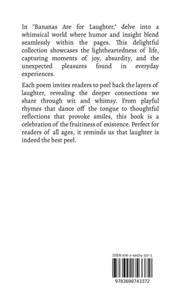 In "Bananas Are for Laughter," delve into a whimsical world where humor and insight blend seamlessly within the pages. This delightful collection showcases the lightheartedness of life, capturing moments of joy, absurdity, and the unexpected pleasures found in everyday experiences. Each poem invites readers to peel back the layers of laughter, revealing the deeper connections we share through wit and whimsy. From playful rhymes that dance off the tongue to thoughtful reflections that provoke smiles, this book is a celebration of the fruitiness of existence. Perfect for readers of all ages, it reminds us that laughter is indeed the best peel.