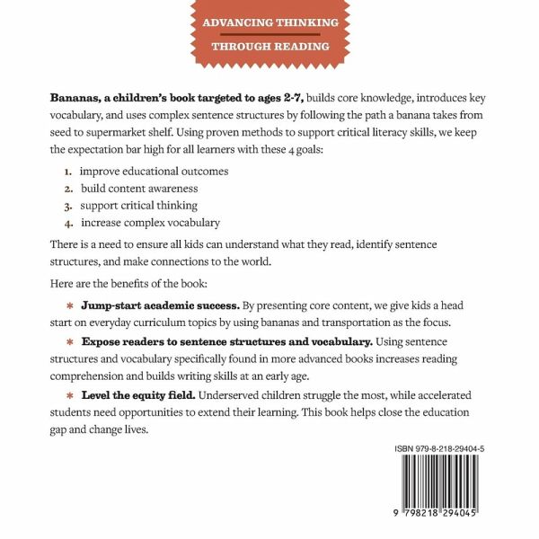 Bananas, a children's book targeted to ages 2-7, builds core knowledge, introduces key vocabulary, and uses complex sentence structures by following the path a banana takes from seed to supermarket shelf. Using proven methods of building core knowledge, we keep the expectation bar high for all learners with these 4 goals: 1. improve educational outcomes 2. build content awareness 3. support critical thinking 4. increase complex vocabulary There is a need to ensure all kids can understand what they read, identify sentence structures, and make connections to the world. Here are the benefits of the book: * Jump-start academic success. By presenting core content, we give kids a head start on everyday curriculum topics by using bananas and transportation as the focus. * Expose readers to sentence structures and vocabulary. Using sentence structures and vocabulary specifically found in more advanced books increases reading comprehension and builds writing skills at an early age. * Level the equity field. Underserved children struggle the most, while accelerated students need opportunities to extend their learning. This book helps close the education gap and change lives.
