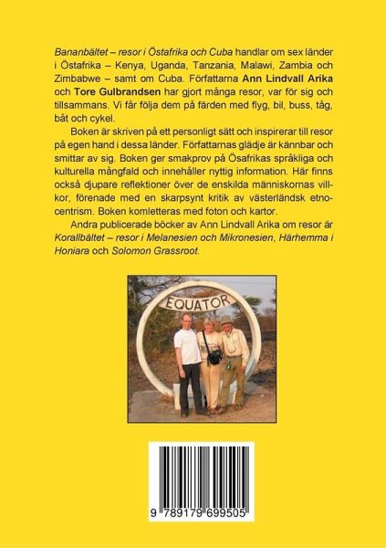 Bananbältet - resor i Östafrika och Cuba handlar om sex länder i Östafrika - Kenya, Uganda, Tanzania, Malawi, Zambia och Zimbabwe - samt om Cuba. Författarna Ann Lindvall Arika och Tore Gulbrandsen har gjort många resor, var för sig och tillsammans. Vi får följa dem på färden med flyg, bil, buss, tåg, båt och cykel. Boken är skriven på ett personligt sätt och inspirerar till resor på egen hand i dessa länder. Författarnas glädje är kännbar och smittar av sig. Boken ger smakprov på Östafrikas språkliga onch kulturella mångfald och innehåller nyttig information. Här finns också djupare reflektioner över de enskilda människornas villkor, förenade med en skarpsynt kritik av västerländsk etnocentrism. Boken komletteras med foton och kartor. Andra publicerade böcker av Ann Lindvall Arika om resor är Korallbältet - resor i Melanesien och Mikronesien, Härhemma i Honiara och Solomon Grassroot.
