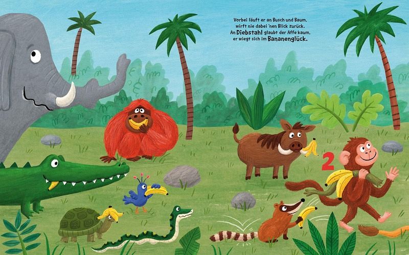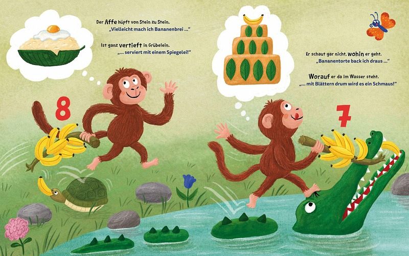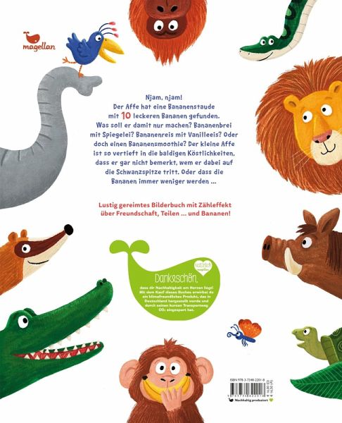 Die Zahlen 1-10 mit Bananen verstehen: Ein lustiges Kinderbuch zum Vorlesen und zum Zählen lernen. Njam, njam! Der Affe hat eine Bananenstaude mit zehn saftigen Bananen gefunden. Welches Gericht soll er mit dieser süßen Frucht nur zubereiten? Bananenbrei mit Spiegelei? Bananenreis mit Vanilleeis? Oder doch einen Bananensmoothie? Der kleine Affe ist so vertieft in die baldigen Köstlichkeiten, dass er auf seinem Weg durch den Dschungel gar nicht bemerkt, wem er dabei auf die Schwanzspitze tritt. Oder dass seine Bananen immer weniger werden ... Die Geschichte um den kleinen Affen zeigt, wie wichtig es ist, mit offenen Augen durch die Welt zu gehen und aufeinander Rücksicht zu nehmen. Die witzigen Reime und schönen Illustrationen bringen dabei positive Werte wie das Teilen bei und machen die Zahlen eins bis zehn schmackhaft. Ein spaßiger Bilderbuchgenuss!