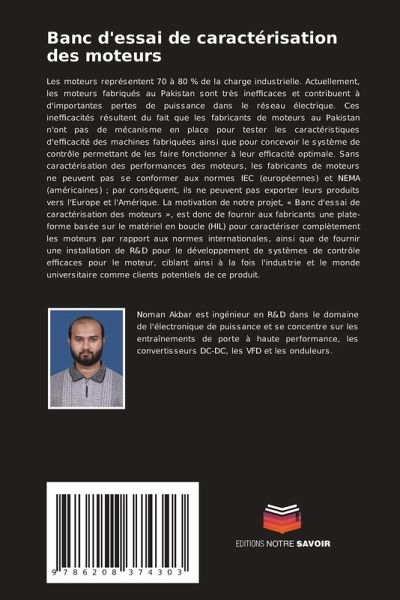 Les moteurs représentent 70 à 80 % de la charge industrielle. Actuellement, les moteurs fabriqués au Pakistan sont très inefficaces et contribuent à d'importantes pertes de puissance dans le réseau électrique. Ces inefficacités résultent du fait que les fabricants de moteurs au Pakistan n'ont pas de mécanisme en place pour tester les caractéristiques d'efficacité des machines fabriquées ainsi que pour concevoir le système de contrôle permettant de les faire fonctionner à leur efficacité optimale. Sans caractérisation des performances des moteurs, les fabricants de moteurs ne peuvent pas se conformer aux normes IEC (européennes) et NEMA (américaines) ; par conséquent, ils ne peuvent pas exporter leurs produits vers l'Europe et l'Amérique. La motivation de notre projet, « Banc d'essai de caractérisation des moteurs », est donc de fournir aux fabricants une plate-forme basée sur le matériel en boucle (HIL) pour caractériser complètement les moteurs par rapport aux normes internationales, ainsi que de fournir une installation de R&D pour le développement de systèmes de contrôle efficaces pour le moteur, ciblant ainsi à la fois l'industrie et le monde universitaire comme clients potentiels de ce produit.