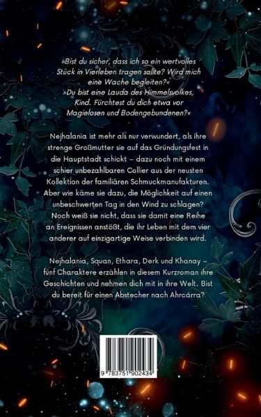 »Bist du sicher, dass ich so ein wertvolles Stück in Vierleben tragen sollte? Wird mich eine Wache begleiten?«»Du bist eine Lauda des Himmelsvolkes, Kind. Fürchtest du dich etwa vor Magielosen und Bodengebundenen?«Nejhalania ist mehr als nur verwundert, als ihre strenge Großmutter sie auf das Gründungsfest in die Hauptstadt schickt - dazu noch mit einem schier unbezahlbaren Collier aus der neusten Kollektion der familiären Schmuckmanufakturen. Aber wie käme sie dazu, die Möglichkeit auf einen unbeschwerten Tag in den Wind zu schlagen?Noch weiß sie nicht, dass sie damit eine Reihe an Ereignissen anstößt, die ihr Leben mit dem vier anderer auf einzigartige Weise verbinden wird.Nejhalania, Squan, Ethara, Derk und Khanay - fünf Charaktere erzählen in diesem Kurzroman ihre Geschichten und nehmen dich mit in ihre Welt. Bist du bereit für einen Abstecher nach Ahrcárra?