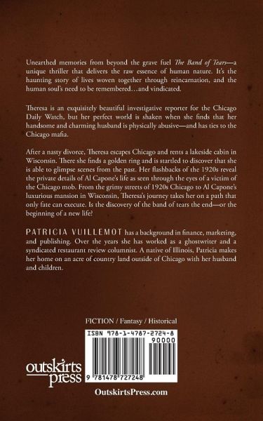 Unearthed memories from beyond the grave fuel The Band of Tears-a unique thriller that delivers the raw essence of human nature. It's the haunting story of lives woven together through reincarnation, and the human soul's need to be remembered...and vindicated. Theresa is an exquisitely beautiful investigative reporter for the Chicago Daily Watch, but her perfect world is shaken when she finds that her handsome and charming husband is physically abusive-and has ties to the Chicago mafia. After a nasty divorce, Theresa escapes Chicago and rents a lakeside cabin in Wisconsin. There she finds a golden ring and is startled to discover that she is able to glimpse scenes from the past. Her flashbacks of the 1920s reveal the private details of Al Capone's life as seen through the eyes of a victim of the Chicago mob. From the grimy streets of 1920s Chicago to Al Capone's luxurious mansion in Wisconsin, Theresa's journey takes her on a path that only fate can execute. Is the discovery of the band of tears the end-or the beginning of a new life?