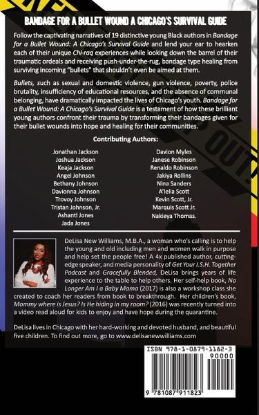 Edited by 4x National Published Authorpreneur DeLisa New Williams, and featuring inner-city's finest young Black authors-Bandage for a Bullet Wound: A Chicago's Survival Guide is an essential collection of captivating stories about what it's like to be Black, young with purpose, and surviving in the streets of Chicago. Follow the captivating narratives of 19 distinctive young Black authors in Bandage for a Bullet Wound: A Chicago's Survival Guide and lend your ear to hearken each of their unique Chi-raq experiences while looking down the barrel of their traumatic ordeals and receiving push-under-the-rug, bandage type healing from surviving incoming "bullets" that shouldn't even be aimed at them. Bullets---such as sexual and domestic violence, gun violence, poverty, police brutality, insufficiency of educational resources, and the absence of communal belonging, have dramatically impacted the lives of Chicago's youth. Bandage for a Bullet Wound: A Chicago's Survival Guide is a testament of how these brilliant young authors confront their trauma by transforming their bandages given for their bullet wounds into hope and healing for their communities.