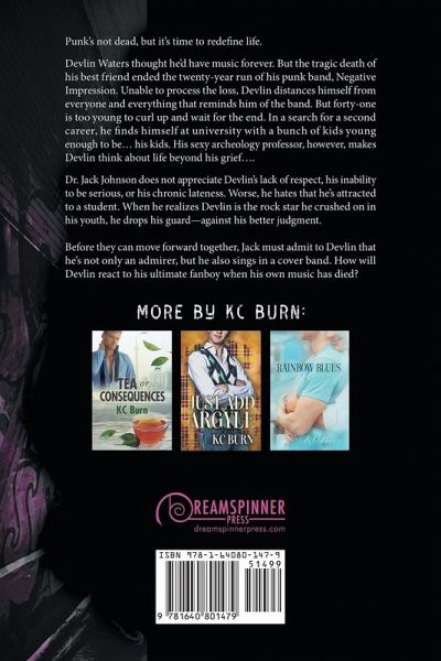 Punk's not dead, but it's time to redefine life. Devlin Waters thought he'd have music forever. But the tragic death of his best friend ended the twenty-year run of his punk band, Negative Impression. Unable to process the loss, Devlin distances himself from everyone and everything that reminds him of the band. But forty-one is too young to curl up and wait for the end. In a search for a second career, he finds himself at university with a bunch of kids young enough to be... his kids. His sexy archeology professor, however, makes Devlin think about life beyond his grief.... Dr. Jack Johnson does not appreciate Devlin's lack of respect, his inability to be serious, or his chronic lateness. Worse, he hates that he's attracted to a student. When he realizes Devlin is the rock star he crushed on in his youth, he drops his guard-against his better judgment. Before they can move forward together, Jack must admit to Devlin that he's not only an admirer, but he also sings in a cover band. How will Devlin react to his ultimate fanboy when his own music has died?