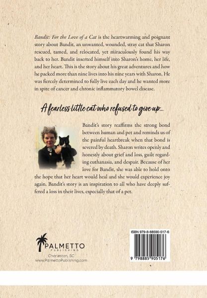 Bandit: For the Love of a Cat is the heartwarming and poignant story about Bandit, a wounded stray cat that Sharon rescued, tamed, relocated, yet miraculously found his way back to her home, and into her heart.