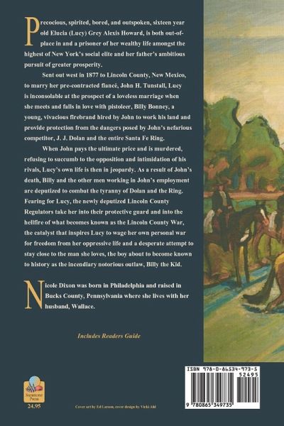 Precocious, spirited, bored, and outspoken, sixteen year old Elucia (Lucy) Grey Alexis Howard, is both out-of-place in and a prisoner of her wealthy life amongst the highest of New York's social elite and her father's ambitious pursuit of greater prosperity. Sent out west in 1877 to Lincoln County, New Mexico, to marry her pre-contracted fiancé, John H. Tunstall, Lucy is inconsolable at the prospect of a loveless marriage when she meets and falls in love with pistoleer, Billy Bonney, a young, vivacious firebrand hired by John to work his land and provide protection from the dangers posed by John's nefarious competitor, J. J. Dolan and the entire Santa Fe Ring. When John pays the ultimate price and is murdered, refusing to succumb to the opposition and intimidation of his rivals, Lucy's own life is then in jeopardy. As a result of John's death, Billy and the other men working in John's employment are deputized to combat the tyranny of Dolan and the Ring. Fearing for Lucy, the newly deputized Lincoln County Regulators take her into their protective guard and into the hellfire of what becomes known as the Lincoln County War, the catalyst that inspires Lucy to wage her own personal war for freedom from her oppressive life and a desperate attempt to stay close to the man she loves, the boy about to become known to history as the incendiary notorious outlaw, Billy the Kid. Includes Readers Guide. NICOLE MADDALO DIXON was born in Philadelphia and raised in Bucks County, Pennsylvania where she lives with her husband, Wallace.